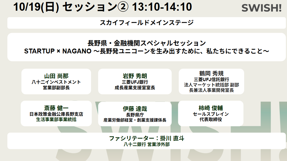 - 登壇者: 山田 尚那 氏 (八十二インベストメント 営業部副部長) ,岩野 秀朗 氏 (三菱UFJ銀行 成長産業支援室室長) ,鶴岡 秀規 氏 (三菱UFJ信託銀行 法人マーケット統括部 副部 長兼法人事業開発室長), 斎藤 健一 氏 (日本政策金融公庫長野支店 生活事業部事業統括), 伊藤 達哉 氏 (長野県庁 産業労働部経営・創業支援課係長) 柿崎 俊輔 氏 (セールスブレイン 代表取締役)